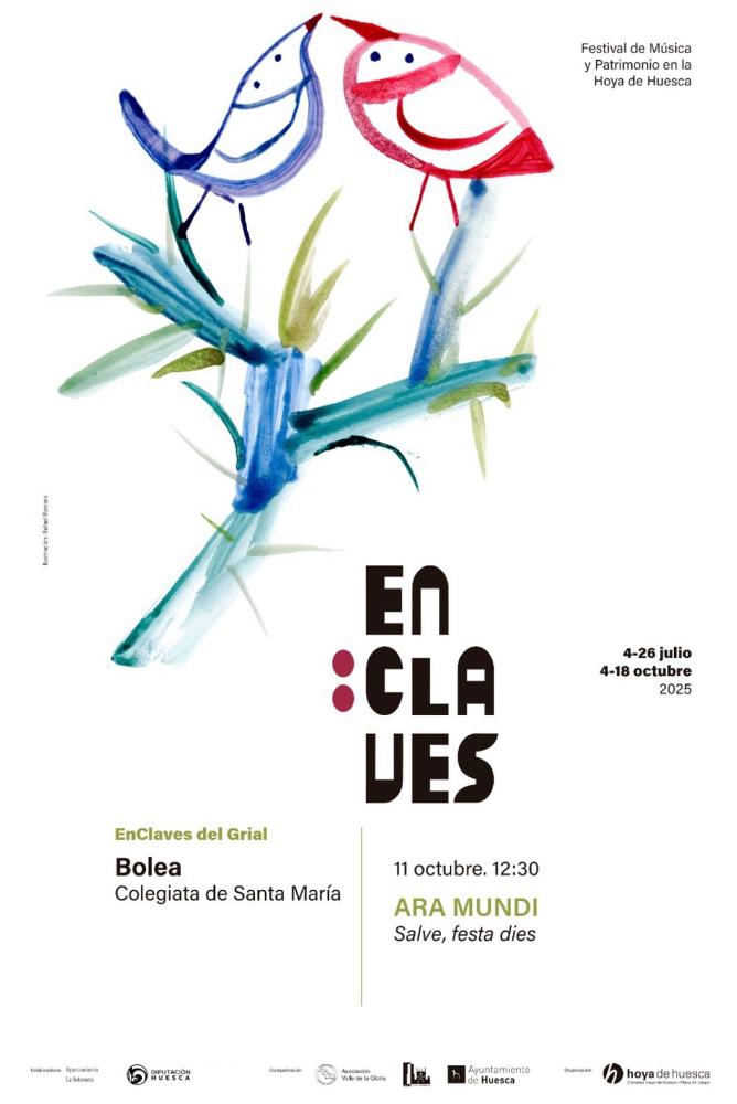 El 11 de octubre, entrada gratuita, en la colegiata de Bolea, a las 12:30 horas “Salve, festa diez” con el dúo aragonés Ara Mundi. Desde danzas del Llibre Vermell a polifonías del Códice de las Huelgas.